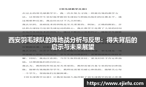 本文将对西安羽毛球队的阵地战进行深入分析与反思,探讨其在比赛中的得失以及未来的发展方向。首先,我们将回顾西安羽毛球队在阵地战中的表现,分析其战术运用、选手发挥及整体配合等方面的优劣势。其次,针对存在的问题提出改进建议,以促进球队在未来赛事中更好地发挥实力。同时,我们还将结合国内外羽毛球发展的趋势,展...